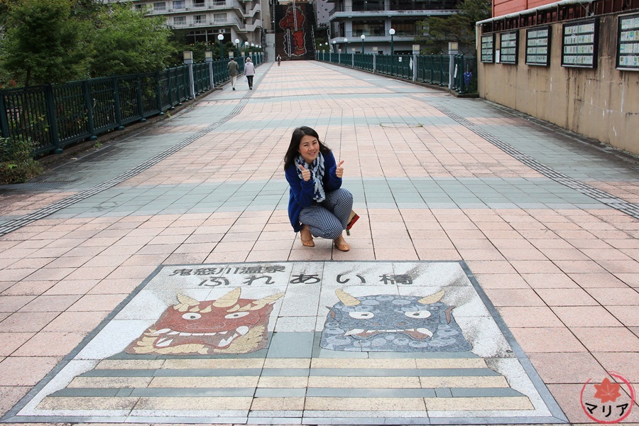 After returning to the hotel and loading our luggage onto the bus, the guide took us on another loop around the hot spring town. We learned that the guide had never been to this town before and was following the GPS, which led us back to the same route we had just walked. However, we discovered that if we had walked past the railway crossing, we would have found a public footbath. Oh well, we missed that spot. If we had had bicycles, we could have saved more walking time. We returned to take pictures at the bridge because many people in the group had not been there.
