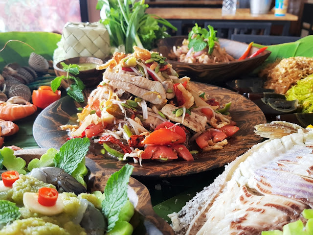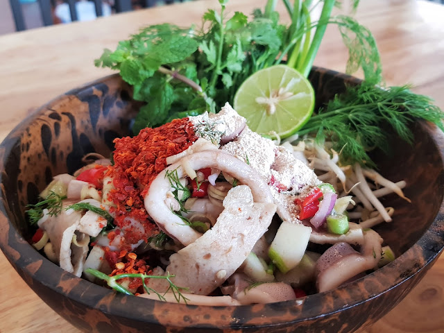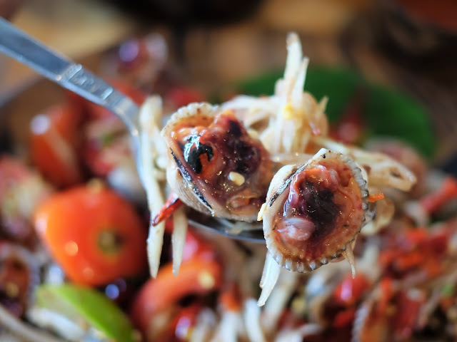 Spicy papaya salad is a must-try dish. Its deliciousness will have you eating with gusto. The secret lies in the fish sauce recipe, which is fragrant and flavorful. No need for additional seasoning. Just add chili, ingredients, a dash of fish sauce, and mix it all together. The result is a heavenly explosion of taste. The vibrant colors are also a treat. The dish we ordered was spicy papaya salad with cockles. It was the perfect combination. Another eye-catching menu item was the "Giant Foot Salad."
