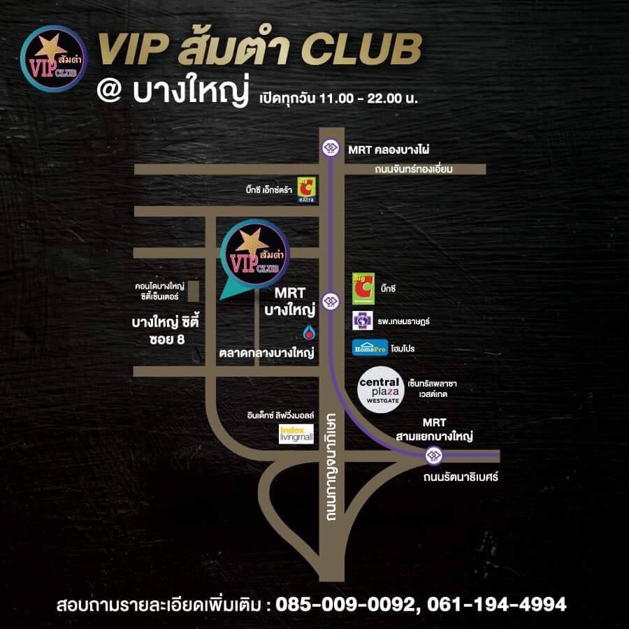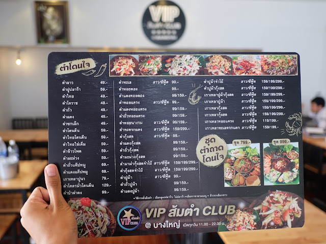 The food at VIP Som Tum Club @ Bangyai City is delicious, especially the papaya salads. If you like your papaya salad extra spicy, be sure to specify "super turbo" when you order, as the regular level of spiciness is moderate. Overall, the restaurant has a pleasant atmosphere and the service is good. The prices are slightly higher than your average papaya salad restaurant, but they are reasonable compared to restaurants in shopping malls or air-conditioned establishments. The quality of the ingredients is high, and the restaurant's proximity to the fresh market ensures that the ingredients are fresh.