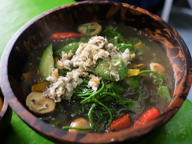 Eating them is a delight, offering a unique and spicy experience. The stir-fried sweet vegetable with red ant eggs is served in a large wooden bowl. The hot soup smells amazing. The broth in the bowl looks similar to "Gaeng Pae," with a rich flavor from roasted rice and fish sauce added in perfect proportions. The sweet vegetables are fresh and not tough. The red ant eggs are a rare treat. If you go during the season, you'll get fresh red ant eggs, which are guaranteed to be delicious. If you go off-season, you'll have to accept that they'll be preserved red ant eggs. However, they still offer some of the experience, satisfying the cravings of red ant egg enthusiasts.