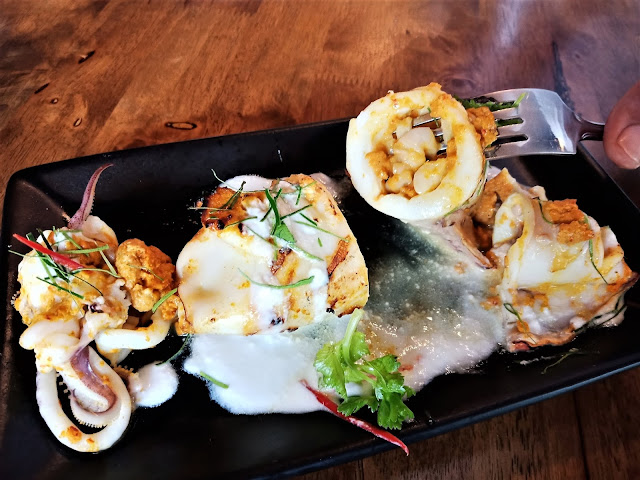 Moon squid is a dish that is not commonly found elsewhere. It is made with large squid, stuffed with squid egg sacs and a curry paste similar to that used in hor mok. The squid is then steamed until cooked through and grilled before serving. This process gives the dish a fragrant aroma and an appealing color. Each bite offers a delightful textural experience.