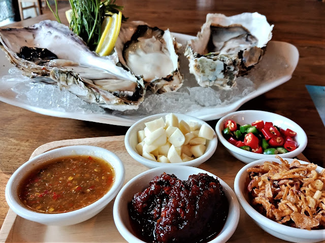 Super Big Scallops with Thai Condiments: These massive scallops, roughly the size of a large man's palm, are sourced from Hokkaido, Japan. Due to their size, one scallop is enough for two people to share. Enjoy them with a variety of Thai-style condiments, including garden chili peppers, garlic, young acacia shoots, crispy fried shallots, roasted chili paste, and our special seafood dipping sauce. At only 180 baht per scallop, the freshness and size make this a great value.